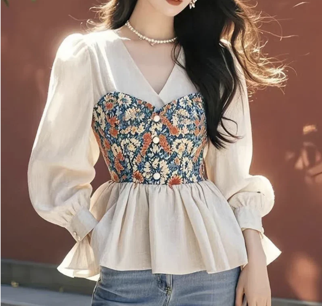 Blus Dua Potong V-neck Ikat Pinggang Gaya Prancis
